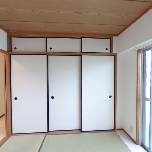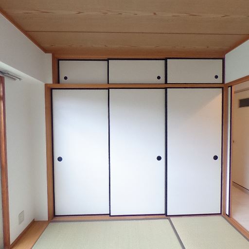 和室の収納が充実(確度90%):天袋付きの押入れが壁面一杯にあり、布団や季節物をしまえる。