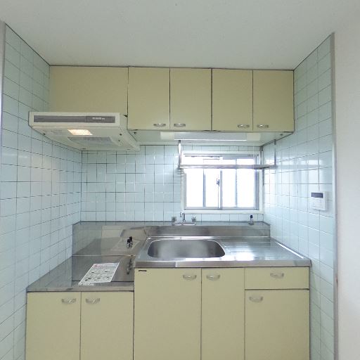 キッチンの状態(確度83%):ステンレス天板と吊戸棚のL字寄りの直線型キッチン。タイル壁で換気扇・小窓あり。年代相応だが清潔に見える。