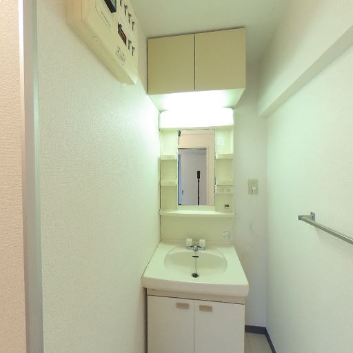 タオルバー・コンセントなど付帯設備(確度78%):壁面にタオルバー、洗面横にコンセントやスイッチが確認できる。
