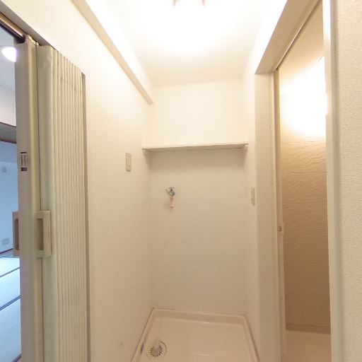 洗濯機置き場が室内に確保(確度88%):防水パン・給水栓・棚がある洗濯機置き場が通路奥にある。