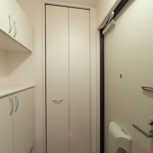 玄関収納が充実している(確度93%):壁面に上下2段の収納と、正面に縦長の収納扉があり、玄関まわりの靴や小物を整理しやすい構成に見える。