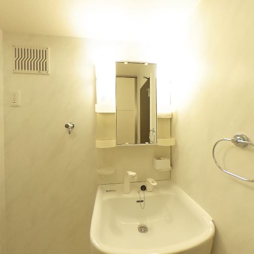 独立洗面台があり身支度しやすそう(確度92%):洗面ボウルと鏡、周辺の小物置きが一体になった独立洗面台が設置されている。浴室内の簡易洗面ではなく、日常の身支度に使いやすい構成に見える。