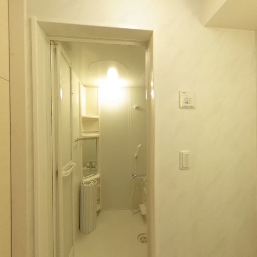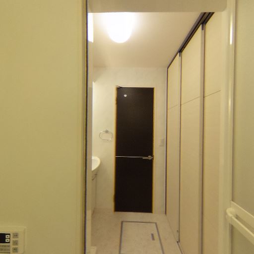 脱衣所側に収納・洗面スペースがまとまっていそう(確度76%):浴室の出入口越しに、洗面ボウル、収納、室内ドアが見え、脱衣所が機能的にまとまった配置に見える。