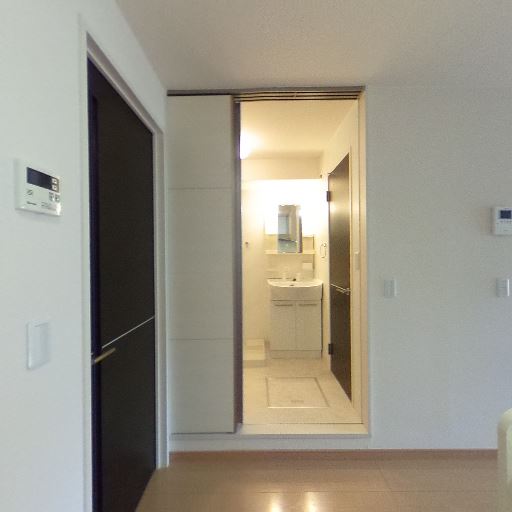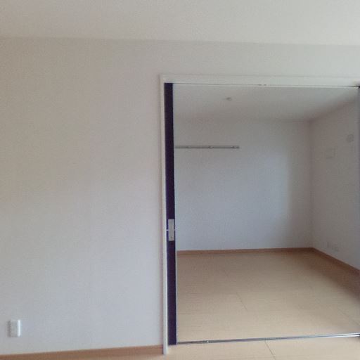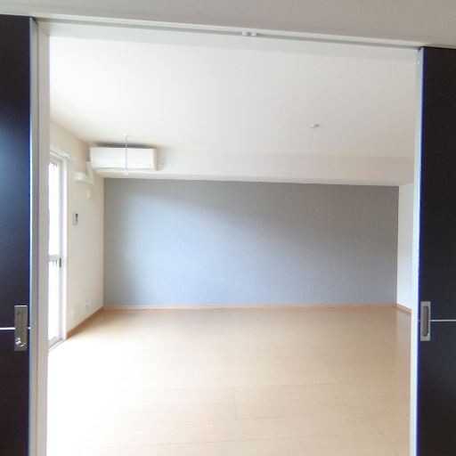隣室と引き戸でつながる間取り(確度87%):開口部が大きく、隣のより広い空間と引き戸でつながっているため、用途に応じて空間を一体的にも区切っても使えそうである。