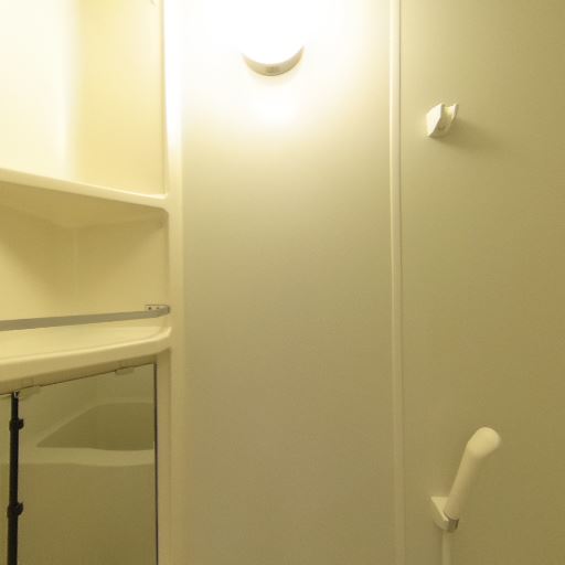 収納棚があって小物を置きやすい(確度90%):壁面に棚が複数あり、シャンプーや洗顔用品などの浴室小物を整理しやすい。