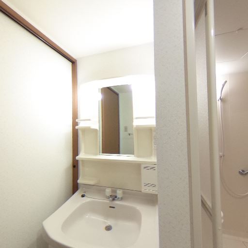 収納・タオル掛けの確保(確度78%):洗面横に棚付きミラー、壁にタオルバーがある。
