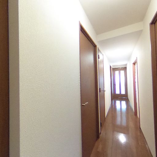 廊下の明るさ(確度73%):廊下の奥にガラス入りの扉があり、自然光が差し込み廊下が比較的明るい。