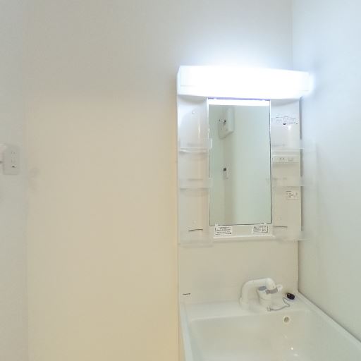 • 洗面台まわりが明るく清潔感がある(確度90%):洗面化粧台の照明が明るく、壁・設備ともに白基調で統一されているため、全体として清潔感のある印象を受ける。