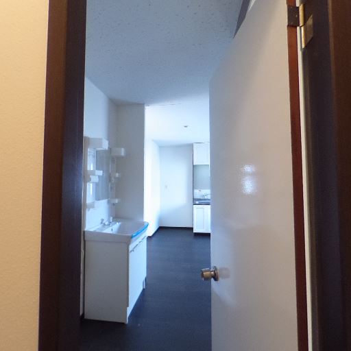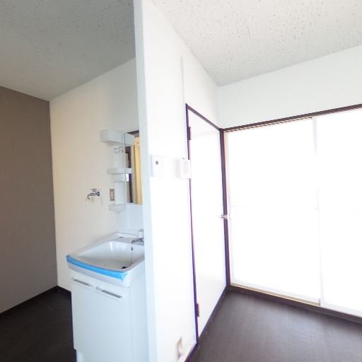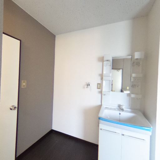 独立洗面台あり(確度86%):部屋の一角に収納付きの独立洗面台が設置されている。