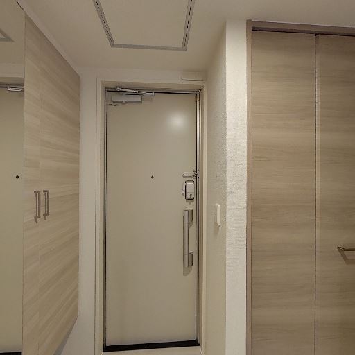 玄関周りの収納が充実(確度80%):玄関脇にトールサイズの収納扉があり、靴や日用品の保管スペースが確保されている。
