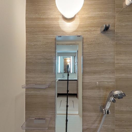 浴室一面の木目調パネルとミラー付き(確度86%):シャワー側の壁が木目調パネルで、縦長ミラーと小物棚が2段設置されている。見た目が温かく収納も確保されている。