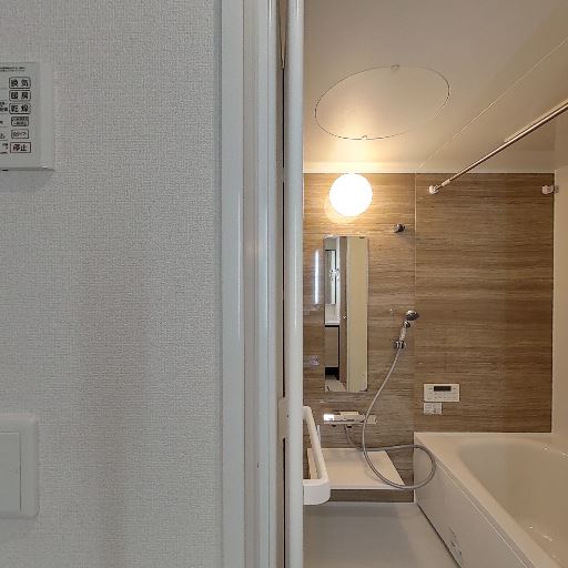 換気設備の存在(確度70%):壁面に換気・浴室乾燥のコントロールパネルが見え、浴室のカビ対策に有効と推測。