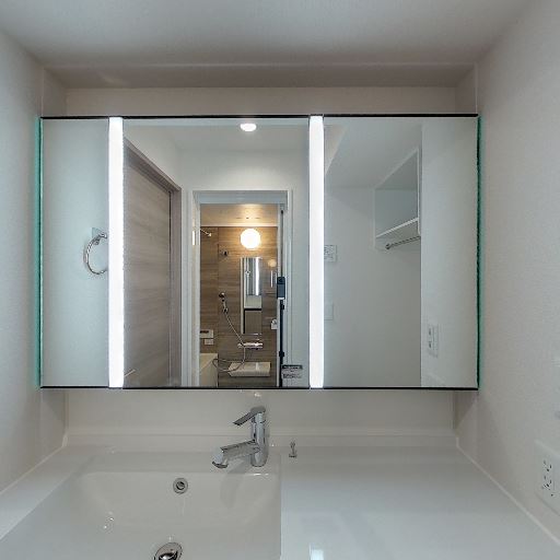 洗面台の広さと収納(確度86%):ワイドな洗面カウンターと大きな三面鏡キャビネットがあり、日用品の収納力が高い。