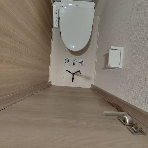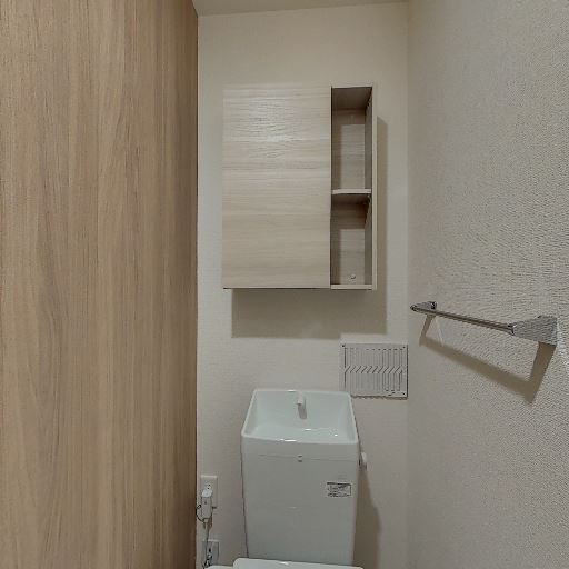 トイレの設備が新しめ(確度82%):タンク一体型の温水洗浄便座が見える。壁付けの操作パネルも確認でき、全体的に使用感は少ない。