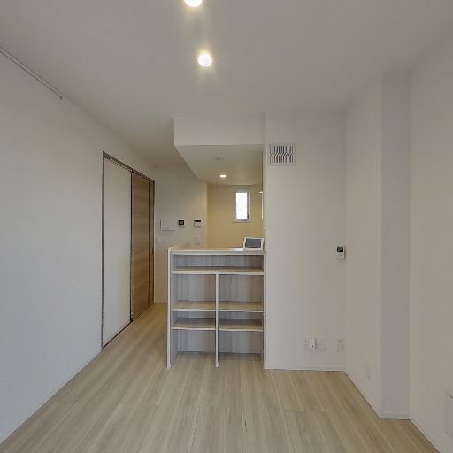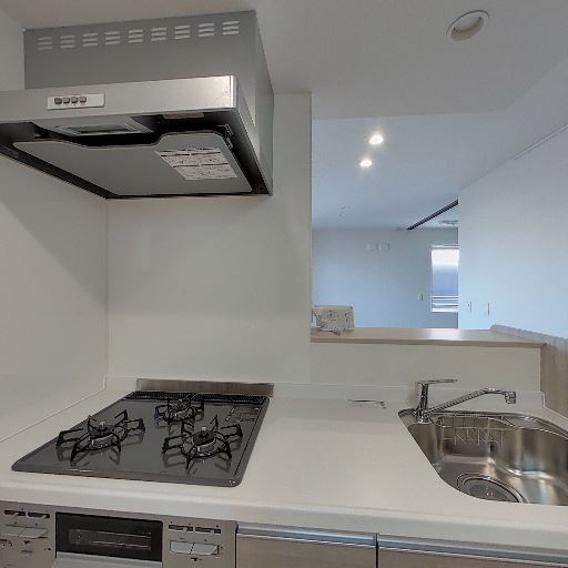 対面型キッチン(確度86%):シンクとコンロが手前にあり、その先にカウンター越しにリビング側が見える配置。