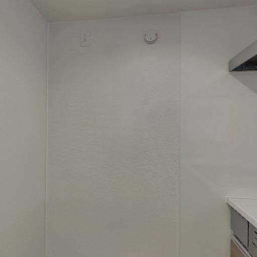 パントリー・冷蔵庫置き場の余白(確度69%):キッチン右側の壁面に広い余白があり、上部にコンセントとフックが見える。冷蔵庫や収納棚を置けるスペースと推測。