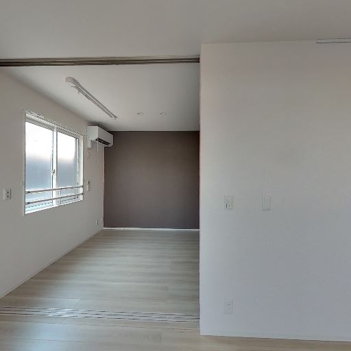 可動間仕切りで2空間に分けられる(確度74%):引き戸レールが床と天井にあり、奥のスペースと仕切れる構造。