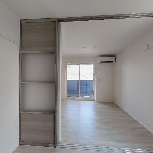 2部屋を仕切れるスライドドア(確度86%):半透明パネルの引き戸で空間を分けられる。開ければ奥の部屋まで一直線に抜けて広く使える。