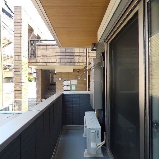バルコニーの広さと形状(確度79%):細長いタイプのバルコニーで、通路幅はやや狭め。室外機が置かれており、人が通るスペースは限られる。