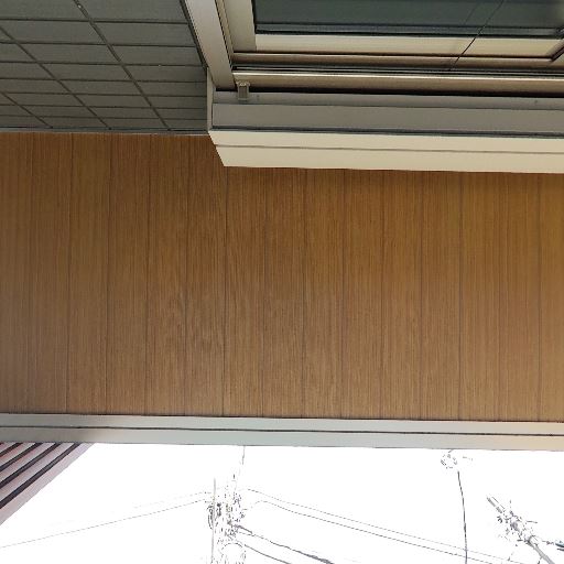 軒天と雨避け(確度71%):天井にしっかりした庇とダウンライトらしき設備があり、雨天時でも多少の雨は防げる。