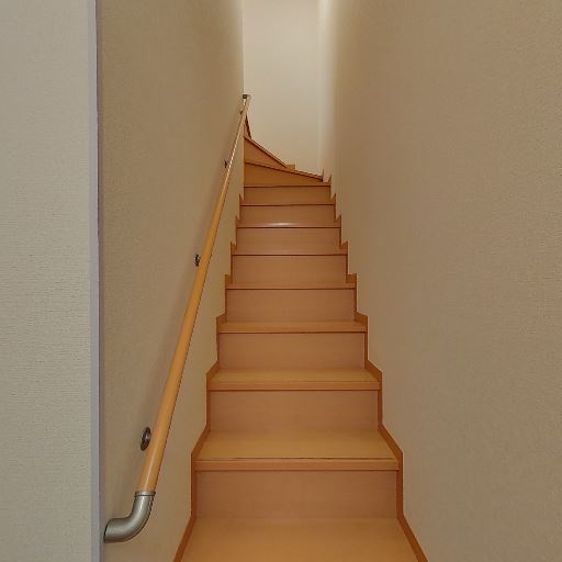 • 階段は急勾配で手すりあり(確度82%):段鼻がくっきりした直線階段で踏面がやや狭め。片側に手すりが設置されている。