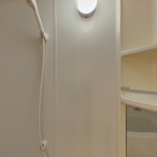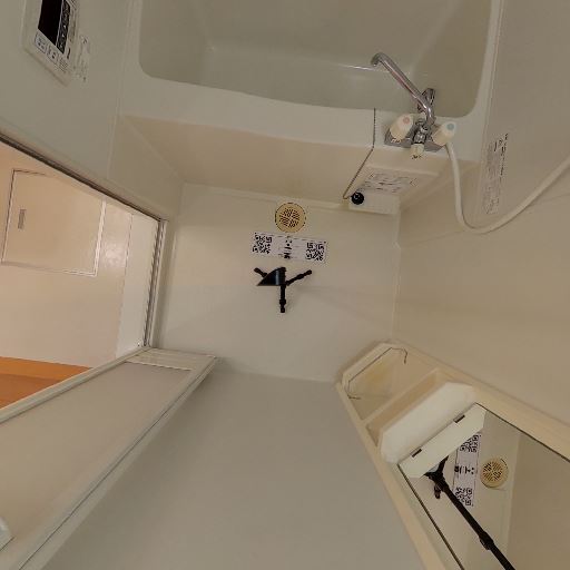 • ユニットバス(浴室)である(確度95%):壁・天井・床が一体成形の樹脂パネルで、浴槽・シャワー・鏡・棚・タオルバー・浴室照明が確認できる。脱衣所とスライドドアで区切られている。