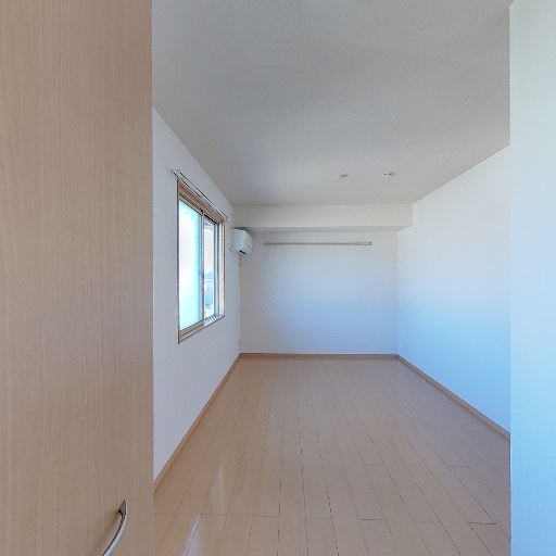 • 洋室の奥行きが長い(確度80%):細長いレイアウトの部屋で、窓とエアコンが側面にあり、奥にさらにスペースが続く。