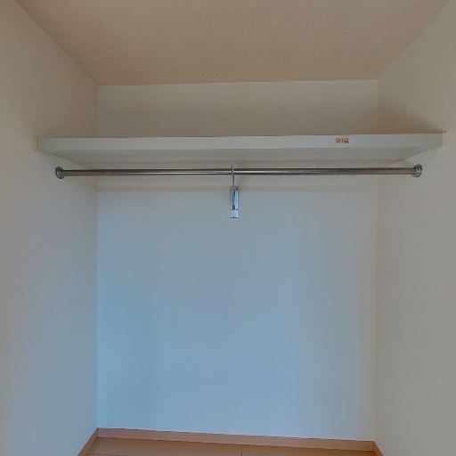 • クローゼットの収納(確度80%):ハンガーパイプと上部棚があるオープンクローゼット。奥行きもありそう。