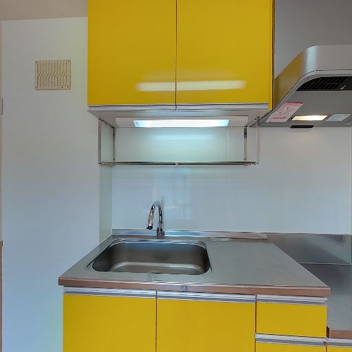 • キッチンのカラーと状態(確度82%):イエローのシステムキッチンで清潔感があり、シンクや天板もきれい。レンジフードや吊り戸棚も整っている。