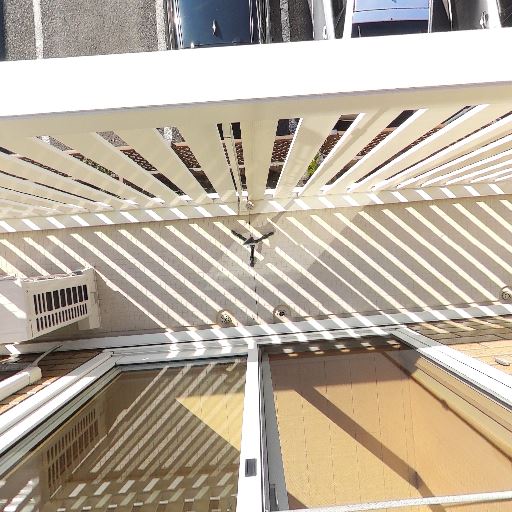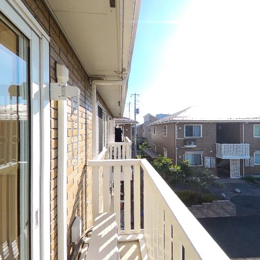 • 日当たりの良さ(確度90%):強い直射日光がバルコニーと室内側に差し込んでいる。青空が広く見え、採光は良好。