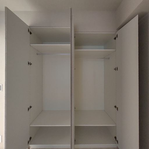 • 収納力のあるクローゼット(確度83%):両開きの大きなクローゼットに可動棚が複数あり、上段・中段・下段で分けて収納できる。