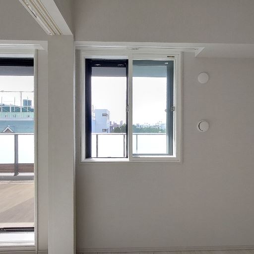• エアコン設置済み(確度86%):掃き出し窓の上部にエアコン本体が確認できる。