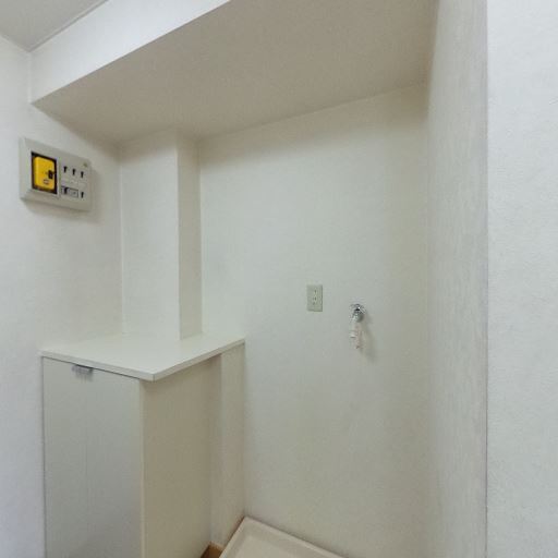 • 室内洗濯機置き場がある(確度98%):壁付けの給水栓と防水パンが見え、室内に洗濯機置き場が設けられている。