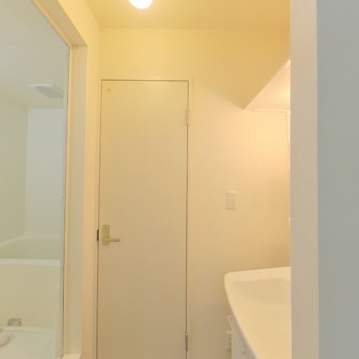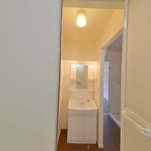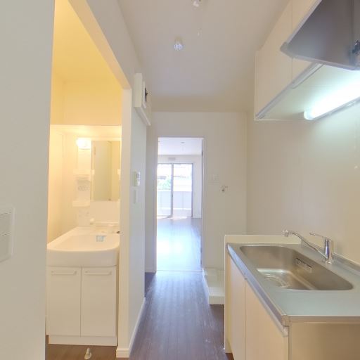 三点ユニットではない独立洗面&浴室(確度78%):洗面台とキッチンが同一空間にあり、浴室は独立している。洗面はミラー収納・照明付き。