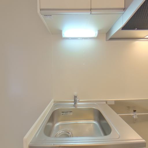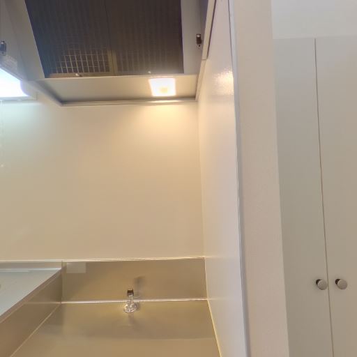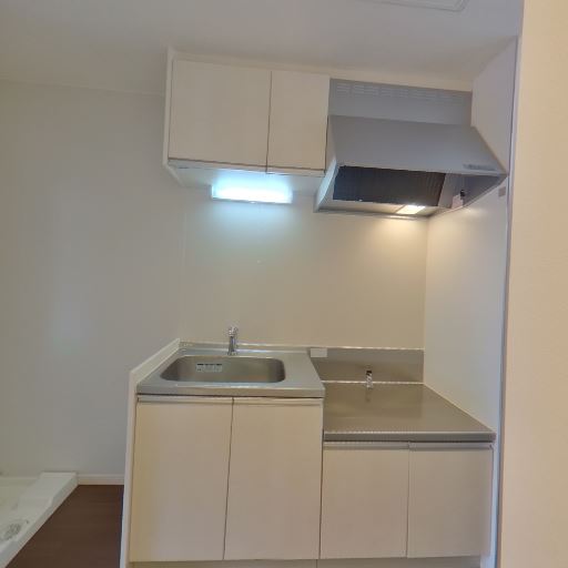 キッチンの設備(確度80%):一口コンロ用のスペースとシンク、レンジフード、吊戸棚あり。作業台は狭め。