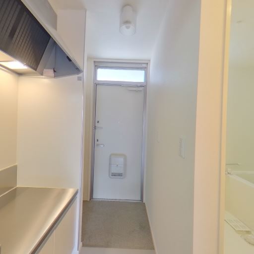 洗濯機置き場の存在(確度86%):キッチン横に洗濯機パンが確認できる。