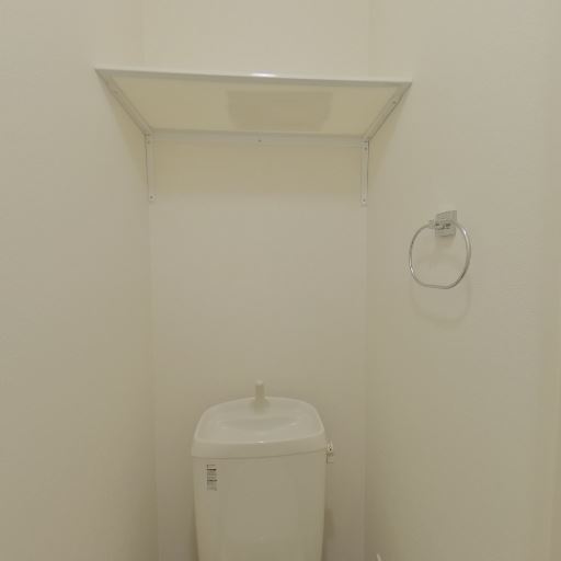 トイレ上部の収納棚(確度86%):便器の上に奥行き浅めのオープン棚が1段あり、トイレットペーパーや掃除用品を置ける。