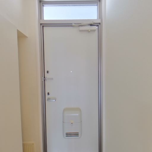 玄関ドアと採光窓(確度78%):玄関ドア上部にすりガラスの採光窓があり、廊下スペースに自然光が入る。ドアは内側にドアクローザー・ポスト口・シューズ脱臭口付き。