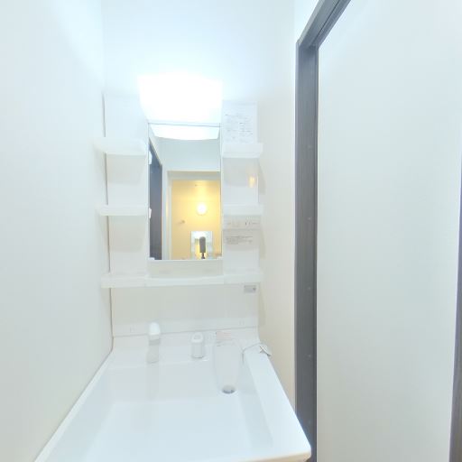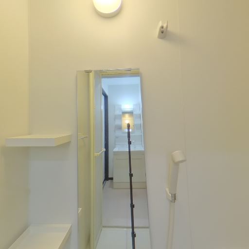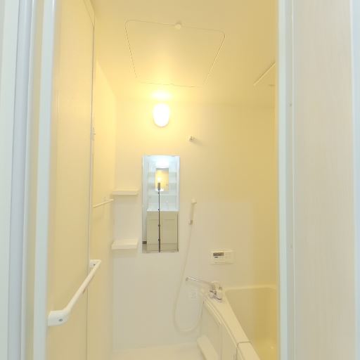 浴室が近接しているユニット動線(確度86%):洗面所からそのまま浴室に入れる配置で、バスタブ・手すり・ミラー・棚・浴室照明が確認できる。