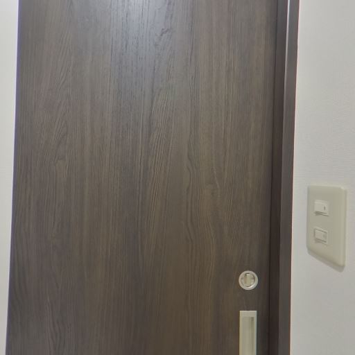 引き戸で省スペース(確度73%):出入口は木目の引き戸で、室内側に出っ張らず動線を圧迫しない。