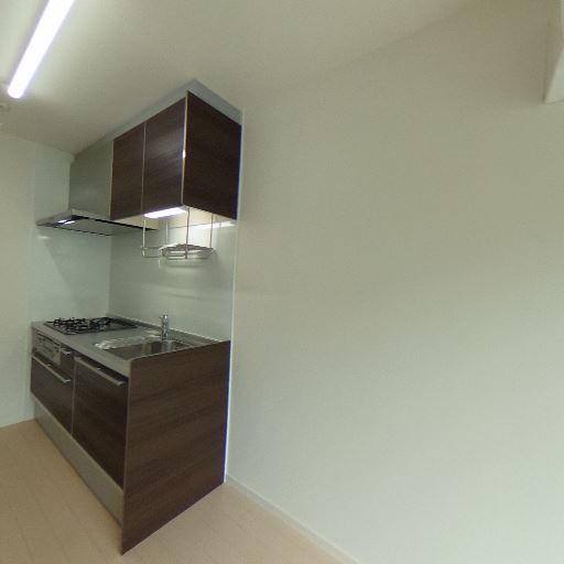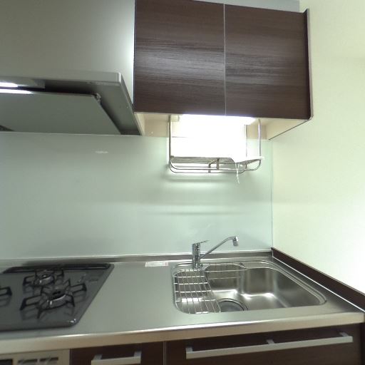 キッチンがコンパクトでも設備充実(確度86%):2口ガスコンロ、換気フード、シンク、吊戸棚、ハンガーラック付きで作業面も確保。