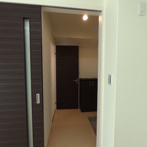 玄関から居室への導線がまっすぐ(確度74%):引き戸の先に廊下と玄関収納が見え、玄関〜キッチン〜居室へ一直線のレイアウト。