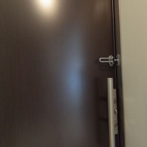 玄関扉とドアガード(確度86%):ダークブラウンの玄関ドアにドアガードが設置されている。縦型の取っ手で開閉しやすそう。