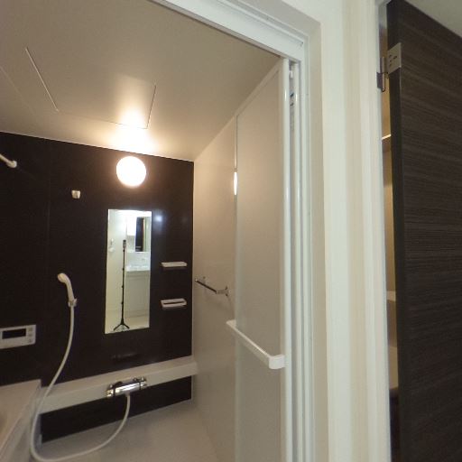 浴室が隣接し導線良好(確度82%):洗面室から引き戸で浴室へ直接アクセス可能。浴槽・棚・鏡などが見える。