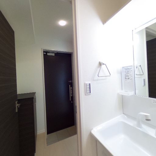 洗面台と鏡面収納が新しめ(確度76%):洗面ボウルやミラーキャビネットが白で清潔感があり、傷みは見当たらない。
