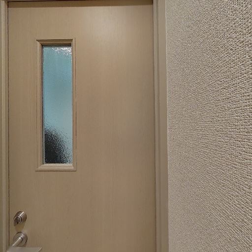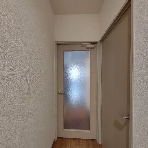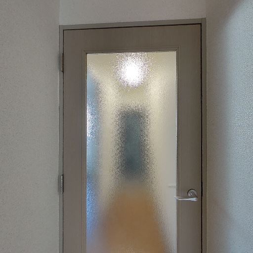 • 廊下側に半透明ガラス扉(確度78%):室内側に曇りガラスの片開き扉があり、向こう側の明かりがぼんやり透けて見える。視線は遮りつつ採光は確保できるタイプ。