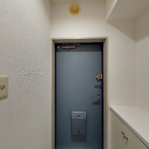 • 天井・壁はシンプルで設備最小限(確度64%):天井はフラットで照明器具は写っておらず、壁面にインターホンやスイッチ類のみ。