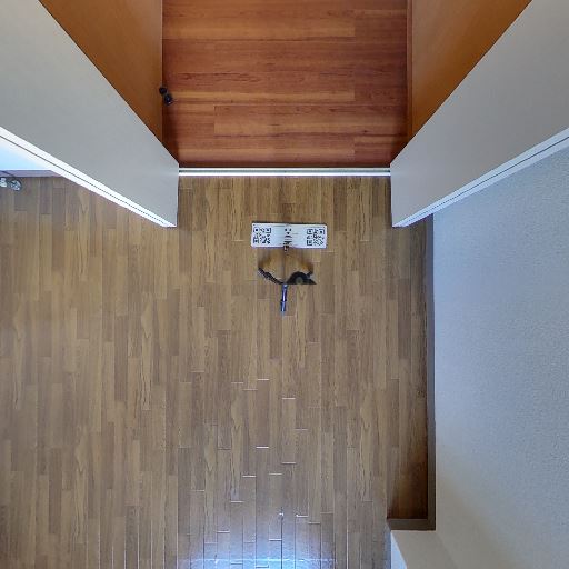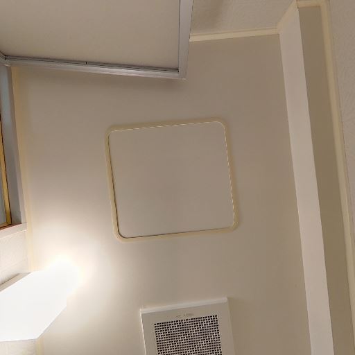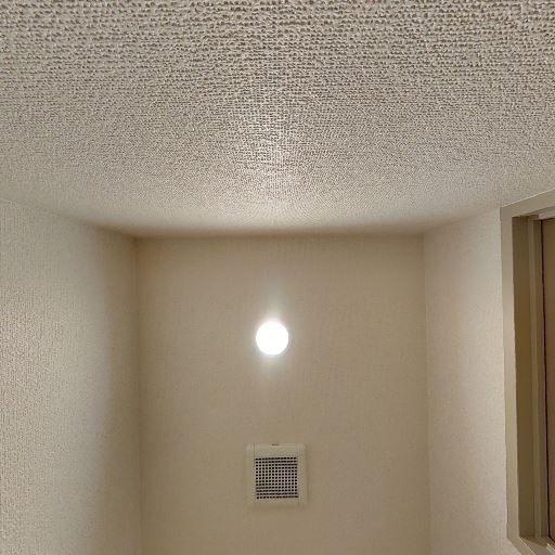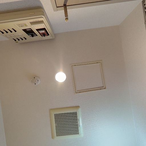• 換気設備と照明(確度86%):天井面にダウンライトと換気口が見える。窓は見当たらない。