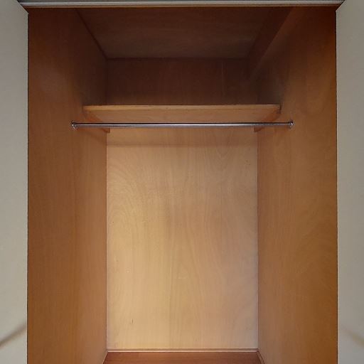 • クローゼットあり(ハンガーパイプ・上棚付き)(確度90%):木製のクローゼット内部が写り、上部に棚とハンガーパイプが備わっている。