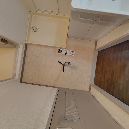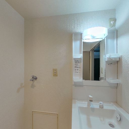 • 脱衣所に洗濯機置き場あり(確度90%):洗面台の向かいに洗濯パンと給水・排水口が設置されている。